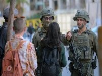 An Israeli soldier stops and questions international activists in the West Bank village of At-Tuwani, October 20, 2024. (Avishay Mohar/ActiveStills)