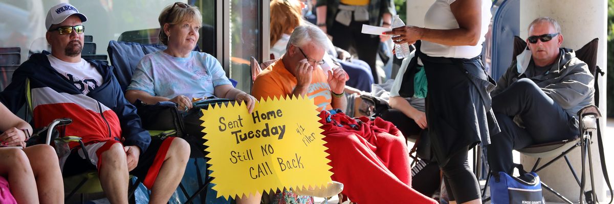 Hundreds of unemployed Kentucky residents wait in long lines outside the Kentucky Career Center for help with their unemployment claims on June 19, 2020 in Frankfort, Kentucky. Photo by John Sommers II/Getty Images
