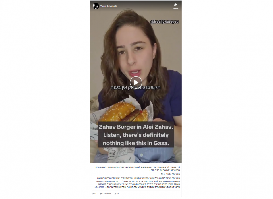She continues: "Wow, okay, that's over. So tasty. A golden burger at Aley Zahav. Listen, there is definitely nothing like this in Gaza. But I found a solution for them, and I totally believe that… [she smirks] they really are hungry, because they never stop nagging us [literally, eating our heads.]Anyway, what they need to do is have all the innocents eat the ones who aren't. Bon appétit." Another bite of the burger.